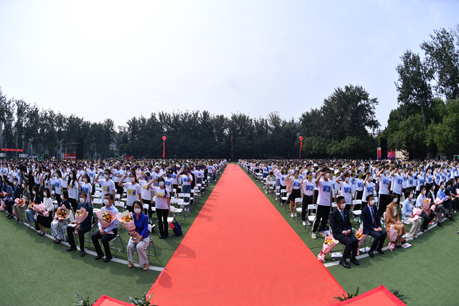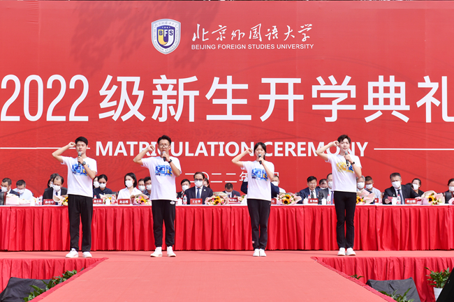 隨后的新生拜師獻花儀式上,新生代表向教師代表鞠躬并獻上鮮花。學生代表帶領全體學生集體宣讀入學誓詞:銘記兼容并蓄、博學篤行的北外校訓,志存高遠,勤學力行。敬師愛校、誠以待人。強健體魄、陽光向上。珍惜韶華,奮發有為。胸懷天下,敢于爭先。不畏艱難,勇擔使命。服務人民,奉獻祖國。
