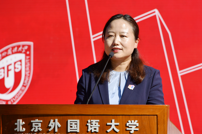 教師代表、專用英語學院黨總支副書記、院長侯俊霞分享了藏族校友美朵刻苦學習外語,回鄉后從事外語教學的感人故事,鼓勵本科生苦練語言基本功,用語言探索世界;鼓勵研究生用學術的語言,在國際舞臺發出中國學者的聲音;鼓勵留學生仔細觀察、用心感受,向世界講述真心實意為構建人類命運共同體盡心盡力的中國。
