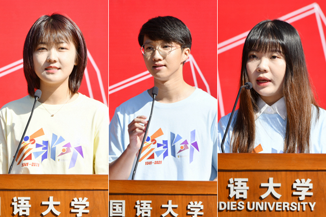 本科新生代表、國際商學院馬瑞遙號召同學們要以一往無前的姿態,不畏艱險、昂揚向上,在新時代同向同行的奮進征程中,綻放出更加絢麗的青春光彩。研究生新生代表、國際組織學院潘天一倡議同學們要學好全球語言,了解全球文化,積極參與全球治理,不辜負學校厚望,不辜負時代重任。留學生代表、中國語言文學學院日本籍學生山川百合表達了把真實向上的中國介紹給世界、促進中日兩國更加友好的良好愿望,希望和同學們一起用語言搭建起中國與其他國家交流的橋梁,推動構建人類命運共同體。